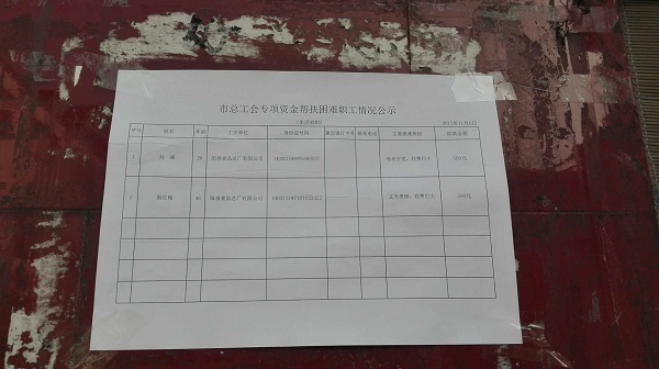 市總工會專項資金幫扶困難職工情況公示
